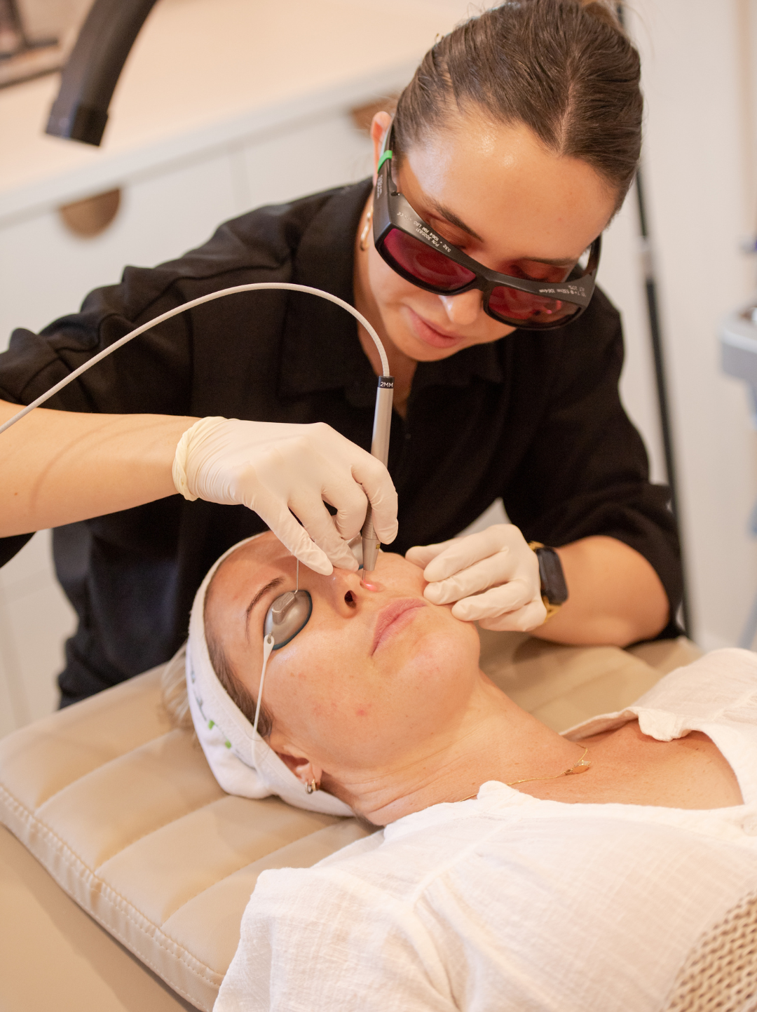 After the session, you may notice mild redness, swelling or temporarily darkened vessels—this will fade within a few days. Use cool compresses, gentle moisturiser and SPF regularly. Avoid heat (sauna, hot baths), strenuous exercise and direct sun for 48 hours. Redness usually subsides quickly and full results develop as vessels are absorbed by your body over the next several weeks.